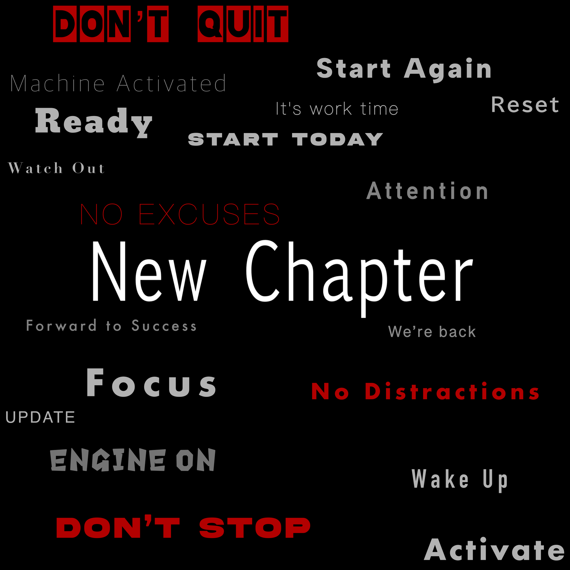 Motivational words in soft gray and re tones surround the main message, adding depth without distraction.